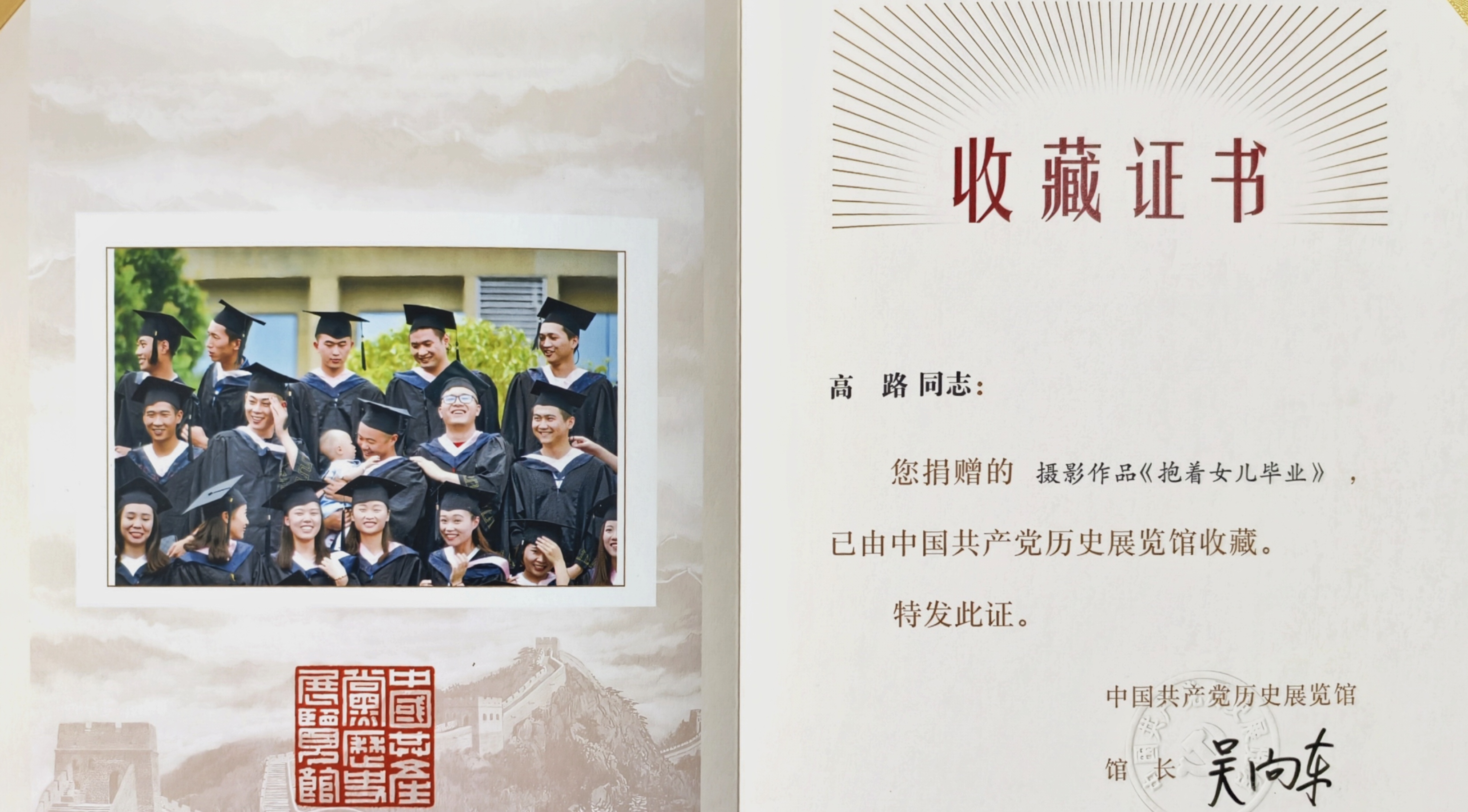 3月20日,民革党员、重庆市涪陵区摄影家协会主席高路收到了来自中国共产党历史展览馆的收藏证书,他的摄影作品《抱着女儿毕业》成为了涪陵区首件被中国共产党历史展览馆收藏的文艺作品。